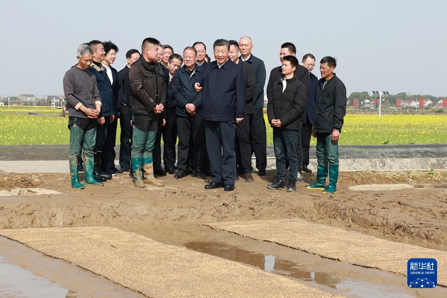 3月18日至21日,中共中央總書記、國家主席、中央軍委主席習近平在湖南考察。這是19日下午,習近平在常德市鼎城區謝家鋪鎮港中坪村,同種糧大戶、農技人員、基層干部親切交流。新華社記者 鞠鵬 攝