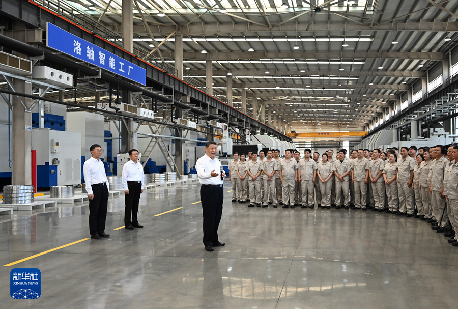 19日下午,習近平首先來到洛陽軸承集團股份有限公司考察。該公司前身為“一五”期間建成的洛陽軸承廠。在智能工廠,習近平了解企業發展歷程,聽取不同類型軸承產品用途和性能介紹,走近生產線察看生產流程。他對圍攏過來的企業職工說,制造業是國民經濟的重要支柱,推進中國式現代化必須保持制造業合理比重。現代制造業離不開科技賦能,要大力加強技術攻關,走自主創新的發展路子。他勉勵職工發揚主人翁精神,在企業發展中奮發有為、多作貢獻。